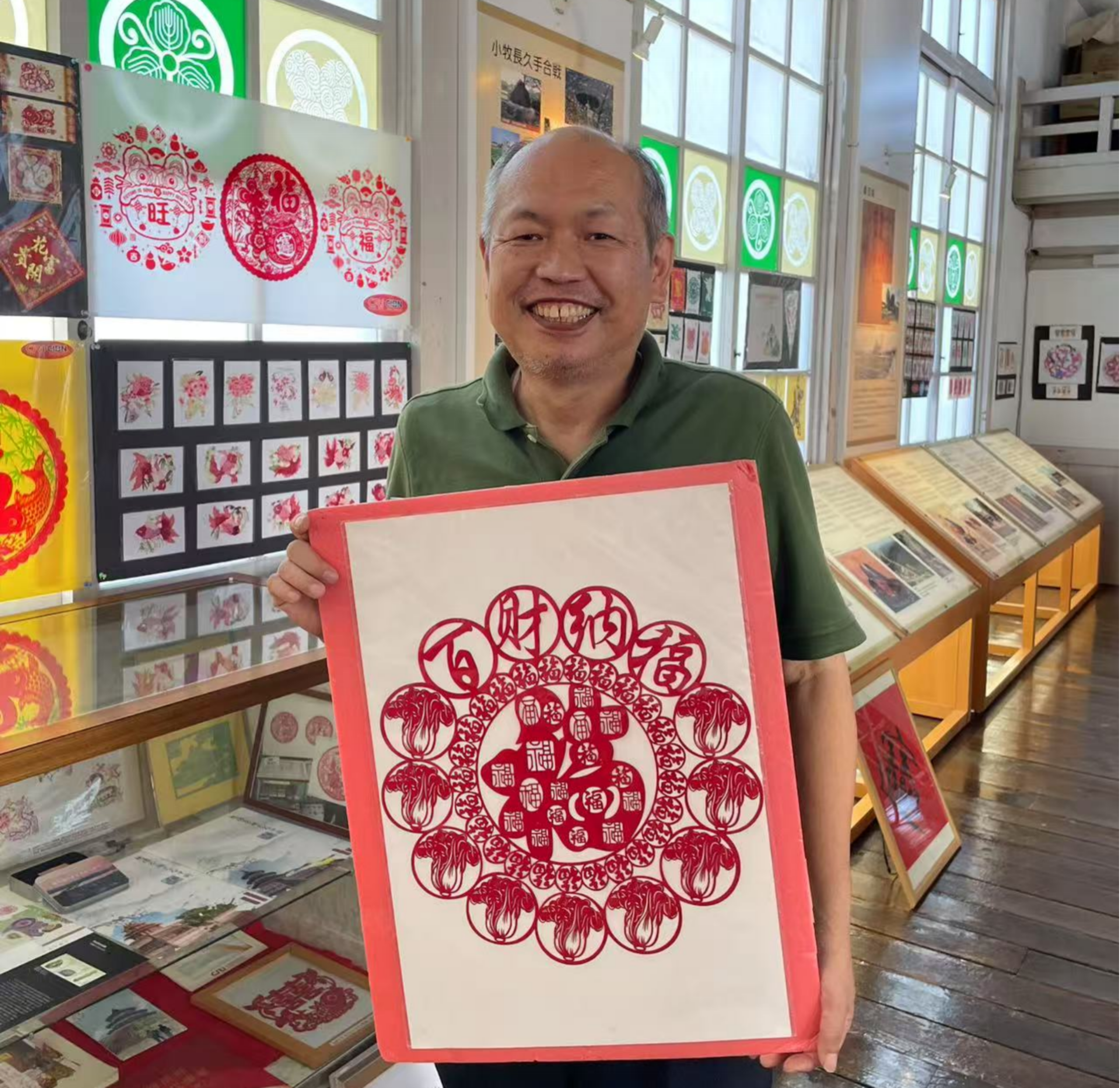 中央広播電視総台日本語放送のリスナーが主催し、愛知県一宮市の木曽川資料館で開催されていた「第20回中国の放送局から収集した切り紙展」が9月28日、無事に終了しました。写真は杁本直正さん。